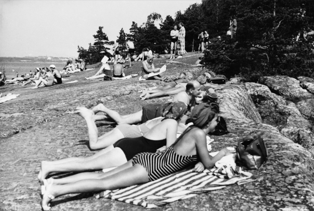 Helsinki – Auringonottoa Pihlajasaaren kallioilla; vedos, paperi pahvi, mv / Wikipedia Creative Commons